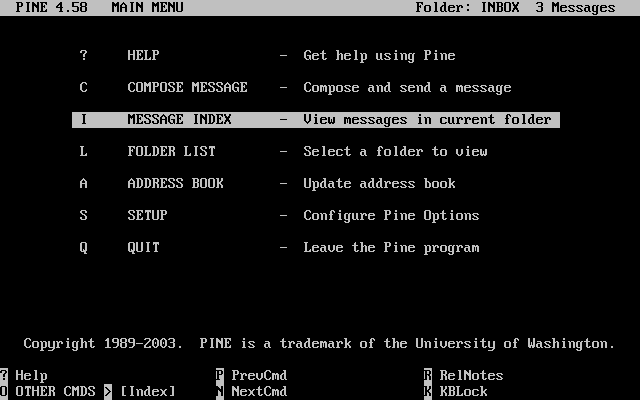 接下来展现给用户的将是主菜单, 可以很容易地通过光标键在上面进行选择。 这个主菜单提供了用于撰写新邮件、 浏览邮件目录, 甚至管理地址簿等等的快捷方式。 主菜单下面是完成各种功能的快捷键说明。